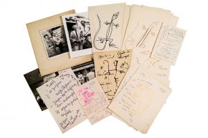 17 juillet 1960 avec dessin d'un personnage tenant un rouleau de papier : «M'avez-vous oublié? J'en serais bien triste. D'autant plus que je voudrais vous montrer le théâtre du Cap d'Ail et vous demander conseil et aide»... 31 août 1960, avec profil à l'oeil en forme de poisson : «Pensez à moi et surveillez mes bronzes et mes lézards»...