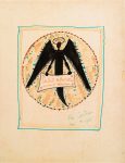 Grand dessin (41 x 34 cm sur feuille 64,5 x 50 cm, rousseurs), lavis d'encre de Chine, aquarelle et feutres de couleur. Archange noir dans un médaillon rehaussé de lavis et encadrement de liseré bleuté, tenant une banderole : «Salut au Président d'Honneur», signé et daté «Jean Cocteau mai 1960».