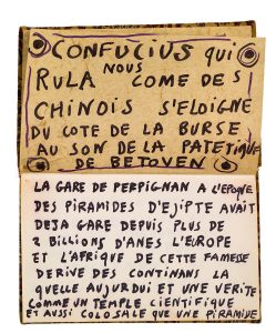 La gare de Perpignan a l'epoque des Piramides d'Ejipte avait déjà gare depuis plus de 2 billions d'anes l'Europe et l'Afrique de cette famesse derive des continans la quelle aujurdui et une verite comme un temple cientifique et aussi colosale que une piramide cibernetique. Ainsi le premier gran traumatisme geologique u lieu entre Sals et Narbone ou moment u se forma par dexirement le golf de Viscaya. [...] Rien nest plus divertisant et joayeux que d'eviner a l'avance que la u je veux en venir et un fait tellement inatandu e remarcable et que dit en peux de mots consiste ni plus ni moins dans la formation du peche originel consecance du d'echirement de l'androgine primordiel en Adan et Eve [...] toutes ses raisons son plus que sufisantes pour que Sigmund Froid arrive pour ordone un peu les complexes et auto rang les traumatismes individuels que ou fond son les memes qui guiden eveuglemen les migrations des anguiles saumons empereurs romains et tous genres de pelerinages qui ne fond que suivre les traumes gravitacionels des tremblements de terre blesures // non cicatrices // de qu'and les continents se dechirerent hermafrodites destine a se dechire a son tour menace de ces hemorroides biblique que pour les apaiser le seigneur ordone que lon etalasse des efigie danus en or pour recobrir ainsi la premiere pile atomique que l'on pretan fut en son temps “l'arche de l'aliance” de sorte que pour arranger les chosses Moisse du dechire la Mer Rouge qui été Eve d'un cote un autre moatie qui fut Adan imposent le monoteisme que ajurdui en plaine revolution culturelle chinoise nus voayons clair come l'eu que cet le contraire du yun et le yong que cet la dualite de Confucius»... Etc.