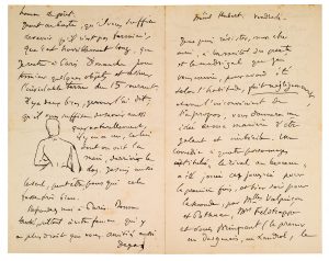 DEGAS EDGAR (1834-1917). L.A.S. «Degas» avec DESSIN, Ménil Hubert Vendredi [3 octobre 1884, à son ami le sculpteur Albert BARTHOLOMÉ] ; 4 pages in-8 (petites fentes au pli médian).
