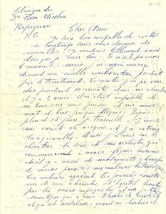 Le Dr NICOLAU et son entourage sont pour lui des anges. Il espère s'améliorer pour reprendre un jour une vie normale et «continuer mes travaux en projet avec les médiums maroger». Il n'écrit pas et n'a de nouvelles de personnes : «Je sais que DERAIN va travailler à Aubusson à des tapisseries, j'en ai une à faire mais je suis incapable de m'y mettre à présent je n'ai qu'une petite maquette de faite».