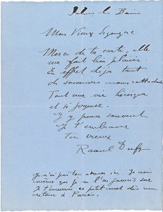 DUFY RAOUL (1877-1953). L.A.S. «Raoul Dufy», Salins-les-Bains [mai 1939], à André DUNOYER DE SEGONZAC ; 1 page in-4 sur papier bleu, enveloppe.