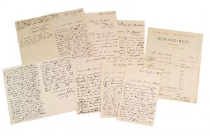 • un relevé du compte de Monet sur papier à en-tête de Durand-Ruel (16, rue Laffitte) au 26 avril 1882, avec les sommes versées du 7 février au 22 avril (5961,55, dont 561,55 de «part de frais» pour l'Exposition de la rue Saint-Honoré), et son avoir pour un achat de 16 tableaux le 22 avril pour 6000 F et 7 tableaux à 400 F le 25 avril (calculs autographes de Monet au crayon au dos).