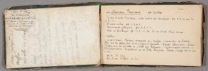 FRAGONARD THÉOPHILE (1806-1876). CARNET DE DESSINS ; 55 pages oblong in-12 (environ 10 x 15 cm), les contreplats recouverts de notes et croquis, dos de parchemin teinté en vert, couverture cartonnée (étiquette du papetier Au Chant de...