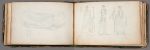 Études et esquisses à la mine de plomb, quelques-unes partiellement repassées à la plume : un bras d'homme, des détails architecturaux, quelques paysages, des statues et groupes antiques (quelques mots en grec), des armoiries et couronnes... On lit sur le premier contreplat quelques références sommaires, la plupart bibliographiques : «Statue antique de Maffoi», «Médaille de Sloch», «Musée Clementin», «Dissertation sur la famille de Niobé par Fabroni», «monuments inédits de Winkelman», «sculpture de la villa Borghese», etc.