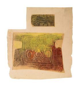 GAUGUIN PAUL (1848-1903). 2 ESTAMPAGES de bois maoris, encre et crayon, l'un colorié ; 11 x 8,5 cm et 3 x 5,5 cm, fixés sur un feuillet in-8 inégalement découpé.