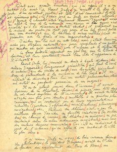[Ce texte a dû être lu à la radio, comme l'indiquent les pauses mar- quées au crayon rouge ; il a été ensuite publié, sous le titre Mon compagnon, dans Les Lettres françaises du 26 mars 1953.] «C'est avec grande émotion que j'ai appris il y a un instant la mort de Raoul DUFY. Je regrette à la fois la perte d'un excellent peintre et celle d'un camarade fidèle et généreux. Oui. La France perd en Dufy un grand coloriste qui, devant le chevalet était également homme d'esprit. Il avait en effet le sens de la retenue à une époque où le génie n'est accordé qu'à la démesure. Artiste savant, il professait que la science du peintre ne doit pas peser d'un trop grand poids sur son oeuvre et que le tableau le mieux combiné doit se présenter avec la grâce d'une improvisation»... Lhote souligne la mesure naturelle de l'artiste et sa thématique récurrente, puis parle du début de leur relation, en 1909, à Orgeville, relation marquée en tout temps par la générosité de son aîné, «déjà notoire», qui mit «au carreau» des esquisses du «jeune peintre inconnu» pour sa première exposition particulière, comme plus tard, il recommanda Lhote à son propre marchand :