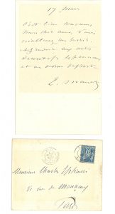 MANET ÉDOUARD (1832-1883). L.A.S. «E. Manet», 17 mars [1882], au critique d'art Charles EPHRUSSI ; ¾ page in-8, enveloppe (légère insolation partielle).
