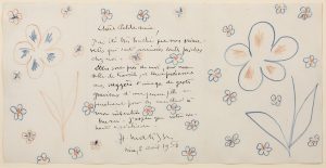 La lettre est encadrée par le dessin de deux grandes fleurs sur leur tige portant deux feuilles, et un semis de 29 petites fleurs couvrant toute la feuille, aux crayons rouge et bleu.