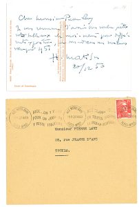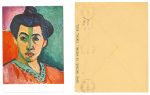 MATISSE HENRI (1869-1954). L.A.S. «H. Matisse», 20 décembre 1950, à Pierre LéVY à Troyes ; 1 page oblong in-8 (au dos d'une carte postale de son tableau Portrait de Madame M. à la raie verte), enveloppe.