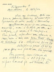 MIRÓ JOAN (1893-1983). L.A.S. «Miró», Barcelone 18 juillet 1954, à Mr. ANDREWS ; 2 pages in-4 à son en-tête.