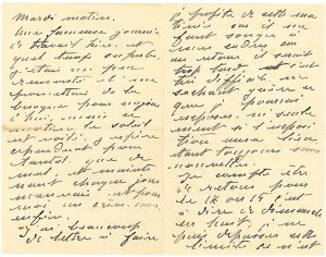 Que de mal, et maintenant chaque jour mauvais est pour moi un crève-coeur. Enfin. J'ai beaucoup de lettres à faire. Je profite de cette matinée car il me faut songer à mes cadres car au retour il serait trop tard. C'est très difficile, ne sachant guère ce que je pourrai exposer, ni seulement si l'exposition aura lieu, étant toujours sans nouvelles». Il compte être de retour dans une semaine : «je ne puis dépasser cette limite ce n'est donc plus que quelques jours à attendre. [...] je voulais écrire à RENOIR de passer chez PETIT mais je m'aperçois que je vous ai donné sa lettre contenant son adresse, ne manquez pas de me l'envoyer»... Il donne des instructions pour replanter les chrysanthèmes dans le potager.