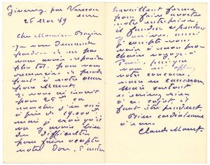 MONET CLAUDE (1840-1926). L.A.S. «Claude Monet», Giverny par Vernon 26 novembre 1889, au journaliste Edmond BAZIRE ; 2 pages in-8 à l'encre violette.