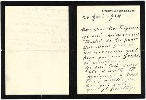 MONET CLAUDE (1840-1926). L.A.S. «Claude Monet», Giverny 20 février 1914, à son cher MONTAIGNAC ; 1 page et demie in-8 à son adresse Giverny par Vernon Eure (deuil).