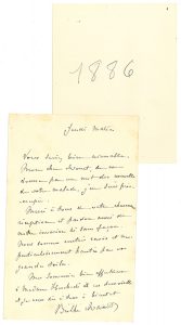 MORISOT BERTHE (1841-1895). 2 L.A.S. «Berthe Manet», 1886, à Claude MONET ; 2 pages et demie in8 (sous petite chemise portant au crayon la date «1886» de la main de Monet ; la partie blanche du second feuillet a été déchirée).