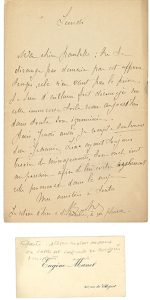 • une carte de visite d'Eugène MANET avec 3 lignes auto- graphes au crayon : «Paule, Albine ne vient pas poser, ta tante est souffrante de migraines très violentes»...