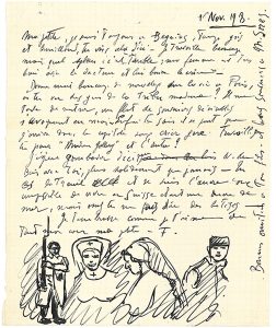 Lettre illustrée d'un dessin à la plume.