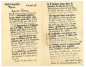PISSARRO CAMILLE (1831-1903). L.A.S. «ton père aff. C. Pissarro», «Hôtel d'Angleterre Rouen» 24 octobre 1896, à son fils Georges PISSARRO [dit MANZANA-PISSARRO] ; 2 pages et demie in-8.