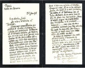 PISSARRO CAMILLE (1831-1903). L.A.S. «ton mari affectionné C. Pissarro», Paris Hôtel du Louvre 23 janvier 1898, à SA FEMME Julie PISSARRO ; 2 pages et demie in-8 (deuil).