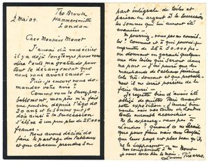 «mon père m'a fait une pension depuis l'âge de 20 ans et la somme que je dois ainsi à la succession s'élève à un peu plus de 25.000 francs. Nous avons décidé de faire le partage des tableaux et que chacun prendra sa part intégrale de toiles et paiera en argent à la succession les sommes qui lui auront été avancées». Il aimerait savoir si un marchand de tableaux lui avancerait cette somme, «en donnant en garantie quelques-unes des toiles qui seront dans ma part». Il a dû quitter Paris avant l'exposition de Monet : «J'aurai bien voulu voir vos toiles de Londres toutes ensemble accrochées. Ne les exposerez-vous pas à Londres? Quand ce ne serait que pour faire voir aux Anglais que leur pays est plus beau qu'ils ne le supposent»...