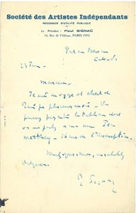 SIGNAC PAUL (1863-1935). L.A.S. «P. Signac», Pont-en-Bessin (Calvados) 23 juin ; 1 page in-8, en-tête Société des Artistes Indépendants.