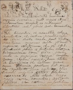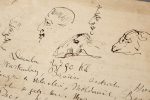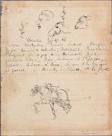Au recto, devoir de latin avec un texte extrait du livre I des Histoires de Salluste : «Nobis primae dissentiones vitio humani ingenii evenere»... ; dans le haut de la page, 18 petits croquis à la plume : caricatures et têtes d'hommes dont un coiffé d'un casque, deux têtes de chien. Au verso, devoir de géographie sur le Danube ; dans le haut, quatre croquis de têtes d'homme de profil et deux têtes d'animal (mouton?) ; dans le bas, dessin d'un cheval de trait.