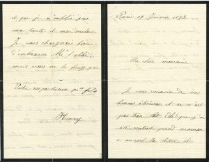 TOULOUSE-LAUTREC HENRI DE (1864-1901). L.A.S. «Henry», Paris 19 janvier 1873, à sa grand-mère maternelle, Louise TAPIÉ DE CÉLEYRAN (qui était aussi sa marraine) ; 4 pages in-8 (petit deuil ; légère fentes au pli réparées, petits trous...