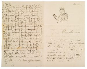 En tête de la lettre, dessin à la plume et mine de plomb (5 x 5 cm), portrait d'un homme à mi-corps, coiffé d'un fez, un bras en avant, légendé «papa Thomson».