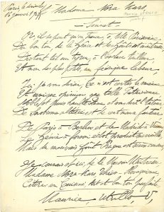 UTRILLO MAURICE (1883-1955). POÈME autographe signé «Maurice Utrillo V», À Madame Nora Kars, Sonnet, Paris 16 janvier 1927 ; 1 page in-4.