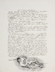 Au bas de la feuille, dessin original à la plume (environ 7 x 15 cm) : nu allongé.
