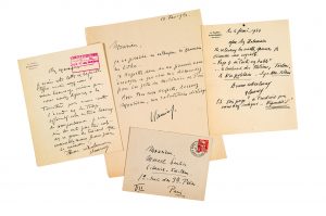 27 juillet 1929, à la Librairie STOCK (cachet de réception), à propos du tirage d'un ouvrage. 4 février 1934, à Maurice DELAMAIN, pour corriger une coquille. 14 février 1951, à Marcel SAUTIER à qui il ne peut rien lui envoyer pour les fêtes du Millénaire de Paris «Je ne possède ni estampes, ni gravures, ni lithos».