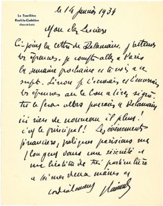 «Ci-joint la lettre de Delamain. J'attends les épreuves. Je compte aller à Paris la semaine prochaine et te voir à ce sujet. Sinon je t'écrirais et t'enverrais les épreuves avec le bon à tirer signé [...] ici rien de nouveau il pleut! c'est le principal! Les événements financiers, poli[ti] ques parisiens me plongent dans une sérénité et une béatitude très particulières»...
