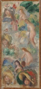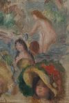 Ambroise Vollard, Pierre Auguste Renoir, Paintings, Pastels and Drawings, San Francisco, 1989, n° 1571, repr. p. 326.Sur cette toile de petit format, Renoir fait se côtoyer de fraiches jeunes filles chapeautées, sur des fonds de verdure suggérés par le travail des tons verts émeraude, et des baigneuses aux longs cheveux dont les courbes généreuses sont le lieu d'une déclinaison des couleurs rosées, chair et presque orangées.