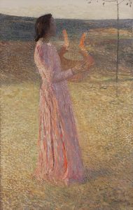 HENRI MARTIN (1860-1943). Femme habillée de rose tenant une lyre au milieu d'un champ, 1894. Huile sur toile, signée et datée en bas à droite 67 x 43.5 cm - 26 3/8 x 17 1/8 in.