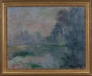 En 1887, la mort d’une tante fait hériter Loiseau une jolie somme qui lui permet d’abandonner sa carrière de décorateur pour ne se concentrer désormais que sur la peinture. Dix ans plus tard, le marchand d’art Durand-Ruel lui propose une série de contrats grâce auxquels il arrive à une véritable indépendance financière. C’est à cette période qu’il peint en plein air, sur les bords de l’Eure, en Normandie. Si des figures humaines viennent souvent animer les paysages qu’il décrit d’habitude, ce ne sont ici que les reflets des cyprès dans l’eau qui recueillent ses faveurs. Les éphémères images des feuillages renvoyées sur le rivage sont captées par des coups de pinceaux spontanés, presque brossés. La variété chromatique de sa palette, ainsi que le geste de l’artiste expriment son extraordinaire capacité à faire la synthèse entre impressionnisme et néo- Impressionnisme.