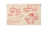 PABLO PICASSO (1881-1973). Composition de plusieurs dessins pour le fils d'Inès. Crayon rouge sur papier au recto et au verso sur une carte publicitaire pour les éditions Les Gémeaux 13.5 x 21 cm - 5 1/4 x 8 1/4 in.