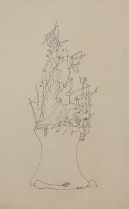 The drawing must have been produced in a single line, creating an inextricable construction of objects that are hard to make out, but seem to include measuring instruments and compasses around a kind of sheet, with a few folds giving harmony to the composition. This assemblage of nuts and points obliges the viewer to try to enter the artist's imagination to understand its meaning