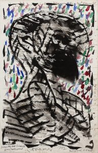 PIERRE ALECHINSKY (1927). Personnage de profil, Bougival, 6 novembre 1987. Encre noire et aquarelle sur papier, signé, daté et dédicacé à Michel Sicard en bas. Sur une lettre manuscrite du 18ème siècle. 36 x 23 cm -14 1/8 x 9 in.