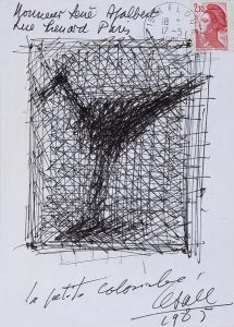 CÉSAR BALDACCINI, DIT CÉSAR (1921-1998). La petite colombe, 1985. Stylo noir sur papier, signé, titré et daté (avec l'adresse du destinataire), sur enveloppe autographe signée, (Saint-Flour 17 mai 1985], à René Ajalbert à Paris, 1 page...