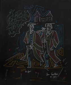 JEAN COCTEAU (1889-1963). Oxford, ou autoportrait en étudiant diplômé, 1956 Dessin au pastel et craies de couleur sur papier noir, signé, titré et daté en bas à droite 55 x 46.5 cm - 21 5/8 x 18 1/4 in.