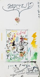NIKI DE SAINT-PHALLE (1930-2002) & ET JEAN TINGUELY (1925-1991) Avignon France Culture 1988. Feutre, gouache, plume, encre et collage sur papier, signé, daté, situé et dédicacé pour Pierre Descargues 53.5 x 28 cm - 21 x 11 in.