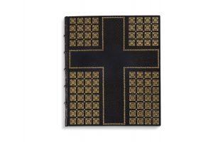 Maroquin noir, décor doré, grande croix dessinée au petit fer cruciforme, alternant ce petit fer avec un fer spécial carré à décor géométrique, dos à nerfs orné des mêmes fers, encadrement intérieur frappé aux angles d'une croix entourée de petits cercles, gardes de soie or. Étui. (René Kieffer).