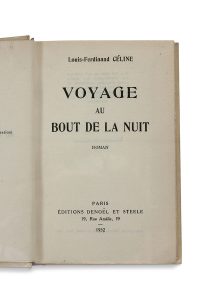 CÉLINE LOUIS-FERDINAND (1894-1961). Voyage au bout de la nuit. Paris, Denoël et Steele, 1932. Fort in-12, papier vélin à dos lisse, titre poussé en noir, couverture et dos conservés. (M. P. Trémois, reliure de l'époque).