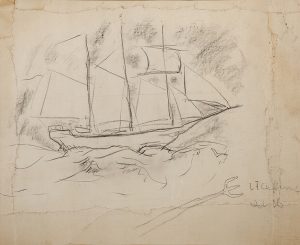 On ne connaît que très peu de dessins de Céline, dont de rarissimes marines, bien qu'il ait agrémenté de croquis quelques lettres, principalement de jeunesse. Il a ainsi illustré d'un trois-mâts une missive à ses parents, écrite en septembre 1907 depuis son école allemande de Diepholz, en Allemagne. En 1939, encore, alors qu'il venait de se faire engager comme médecin militaire sur le Chella qui faisait la liaison Marseille-Casablanca, il dessine son «rafiot» à vapeur dans une lettre de décembre 1939 adressée à son ami Gen Paul.