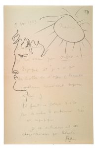 COCTEAU JEAN (1889-1963). Lettre autographe signée avec dessin original, adressée à sa traductrice anglaise Mary HOECK. Madrid, 9 novembre 1953, 1 page et quart in-8 à l'encre au stylo bille, dessin au crayon.