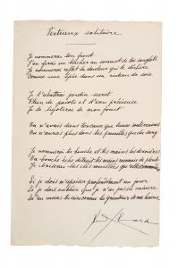 ÉLUARD PAUL (1895-1952). Vertueux solitaire, poème autographe signé. S.l., [vers 1938], poème de 5 strophes in-folio à l'encre.