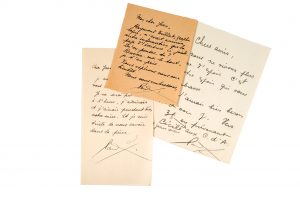 •1/[s.d.] 1 page in-12 à la mine de plomb. «Cher amis, nous ne vivons plus que d'espoir. C'est notre espoir qui vous embrasse. J'aurais bien besoin de voir J.[ean Paulhan] Vers 3 h en prévenant Cécile aux C.[ahiers] d' A.[art] 2 jours avant».