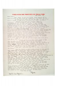 HEMINGWAY ERNEST (1899-1961). Lettre tapuscrite signée «Papa» adressée à Peter VIERTEL. Cuba, 1er mai 1958, en anglais, 1 page in-4 sur papier à en-tête «Finca Vigia San Francisco de Paula Cuba»