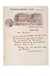 MAETERLINK MAURICE (1862-1949). Lettre autographe signée. [Francfort-sur-le-Main], 8 novembre 1903, 1 page in-4 à l'encre sur papier en tête «Frankfurter-Hof», vignette «Je n'ai pas le plaisir de connaître autrement que par ses oeuvres que...