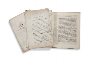 Le Coup de Pistolet est le premier des Récits de feu Ivan Petrovitch Bielkine de Pouchkine publié en russe en 1830. 15 pages in-folio en feuilles chiffrées, avec de nombreuses corrections et ajouts autographes, illustré d'un dessin original à la plume et encre noire de Mérimée représentant un buste d'homme de profil à moustache et favoris arborant une décoration à la boutonnière. (Sous chemise).
